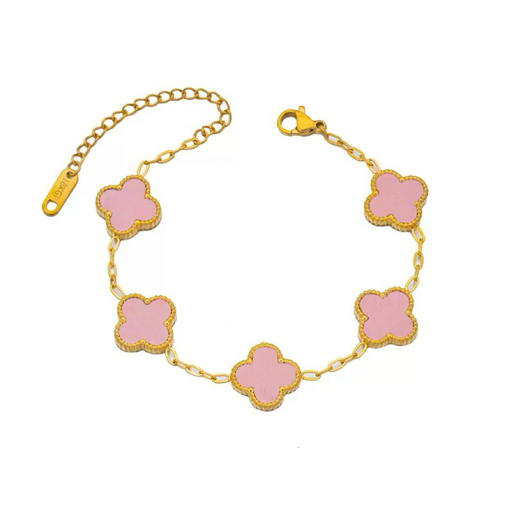 Elegant bracelet featuring pink clover charms on a gold chain.