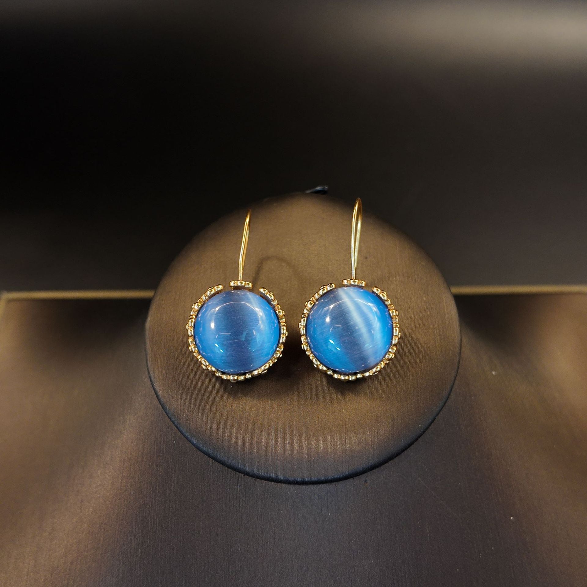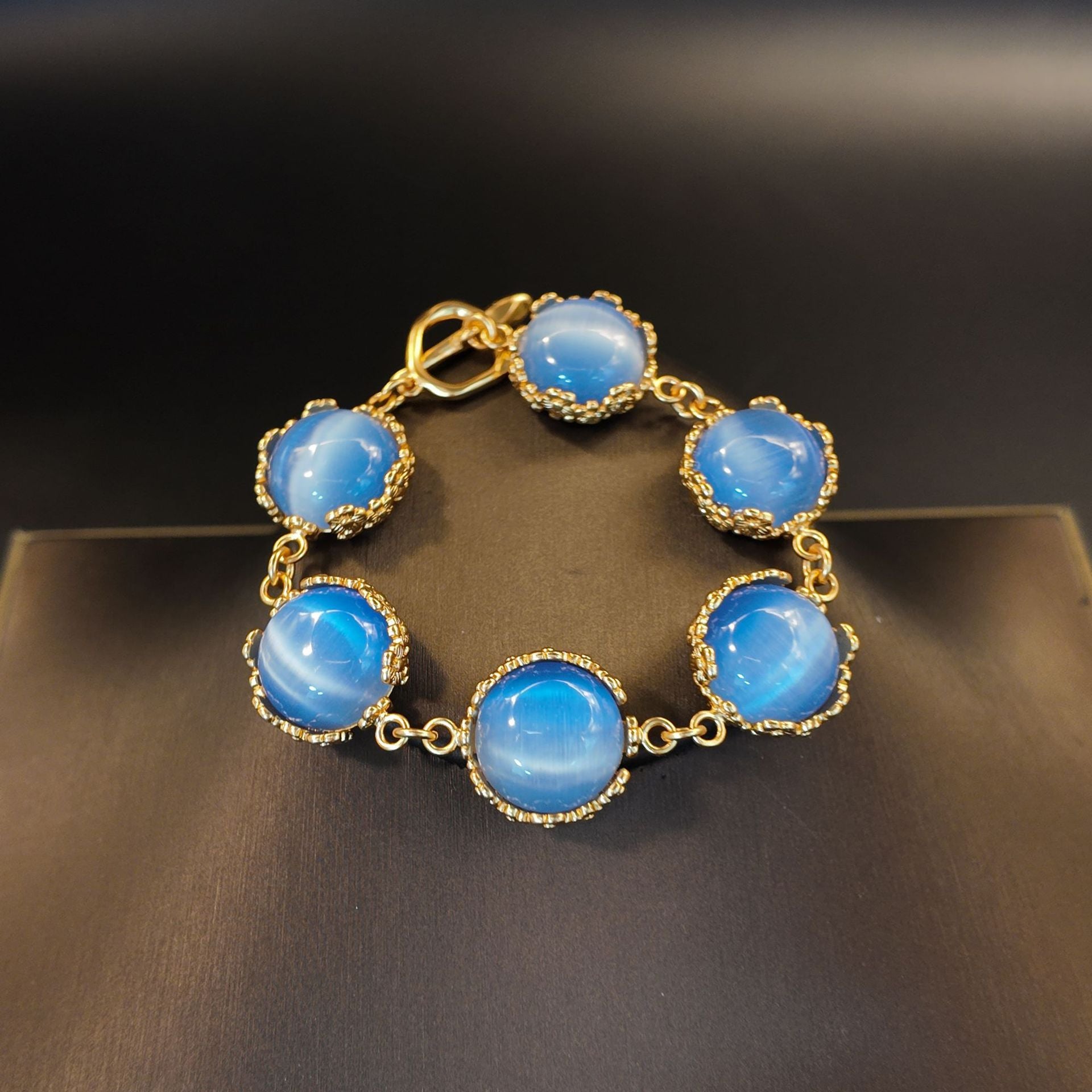 Vintage Blue Cat Eye Stone Flower Embossed Pattern Bracelet and Necklace with Hook Earrings